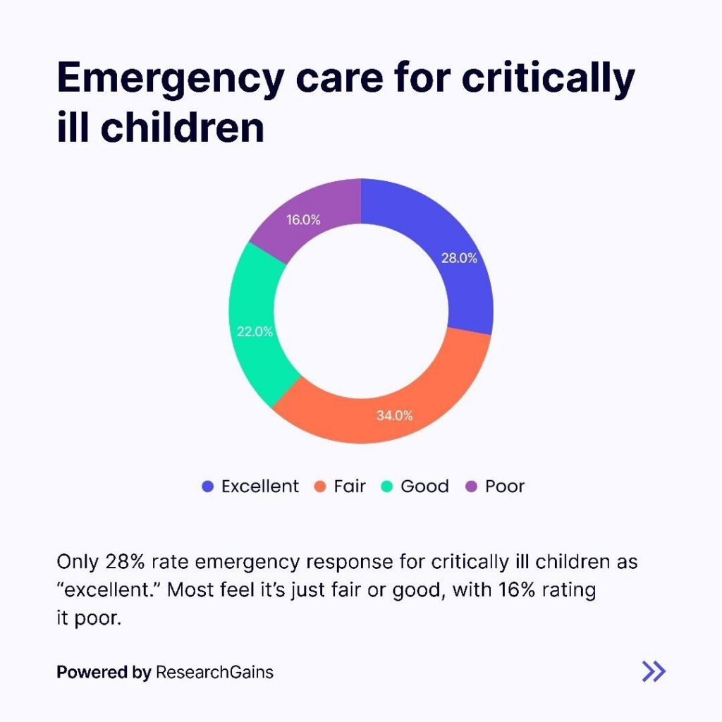 The quality of emergency response in Nigerian hospitals is also a concern. Only twenty-eight percent rated it as excellent, while thirty-four percent described it as fair. Twenty-two percent considered it good, and sixteen percent said it was poor. This indicates that a large share of respondents see weaknesses in emergency care. In life-threatening situations for children, every second counts, and delays in response often determine survival.