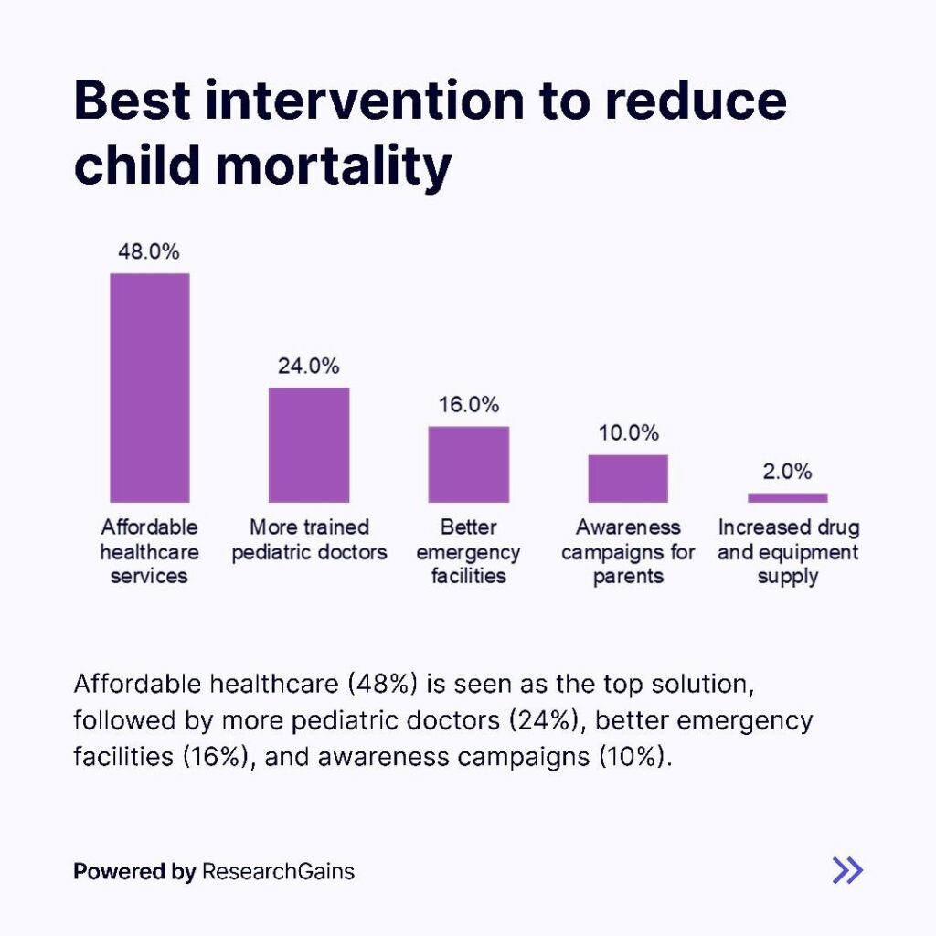 Finally, respondents were asked which interventions would have the greatest impact in reducing child mortality. Nearly half, forty-eight percent, said affordable healthcare services would make the most difference. Twenty-four percent pointed to more trained pediatric doctors, sixteen percent chose better emergency facilities, ten percent mentioned awareness campaigns for parents, and two percent selected increased supply of drugs and equipment. The findings reinforce the fact that affordability and accessibility are core to saving lives.