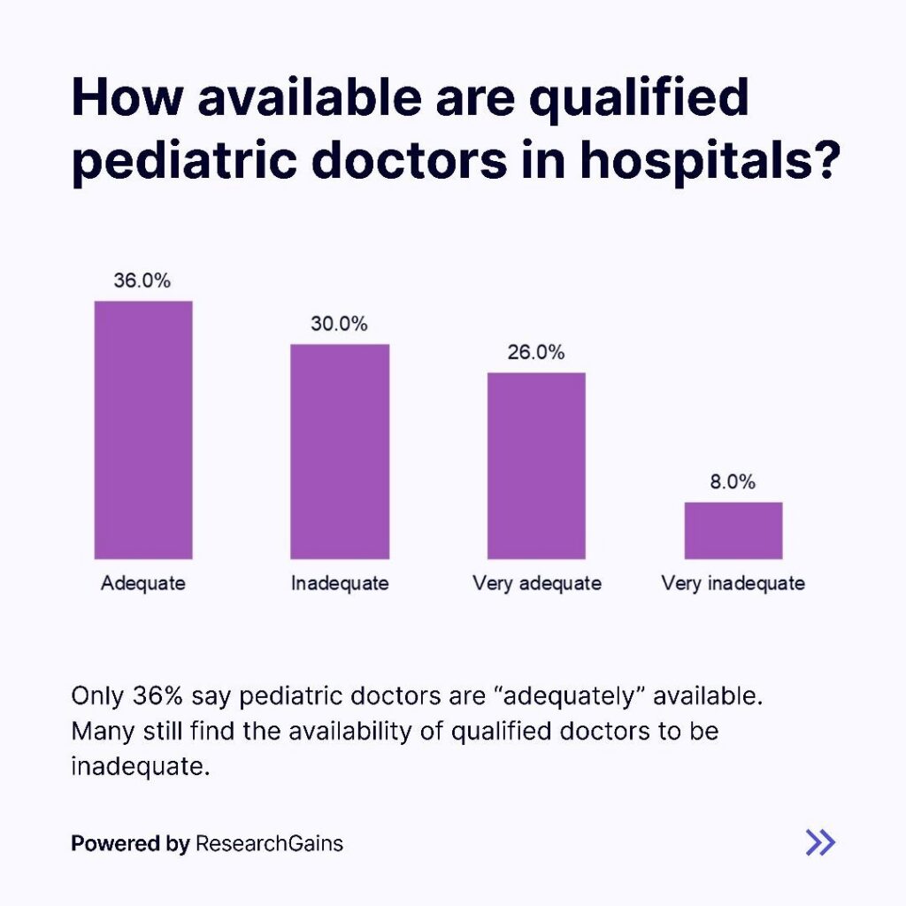 Respondents were asked to rate the availability of pediatric doctors in hospitals. Thirty-six percent described availability as adequate, while thirty percent said it was inadequate. Twenty-six percent rated it very adequate, while eight percent rated it very inadequate. This variation reflects unequal access to specialized care across hospitals. The shortage of qualified pediatric doctors increases the risk of delayed treatment and misdiagnosis, which can lead to preventable deaths.