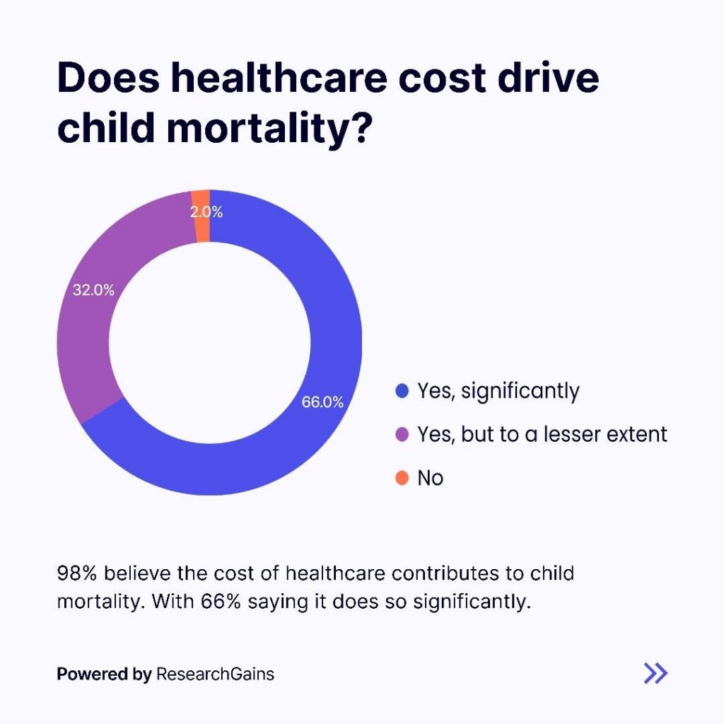The role of healthcare costs cannot be ignored. An overwhelming ninety-eight percent of respondents believe that cost contributes to child mortality. Of these, sixty-six percent said it contributes significantly, while thirty-two percent believe it contributes to a lesser extent. Only two percent said cost does not play a role. This demonstrates how financial barriers prevent families from accessing the medical care their children need.
