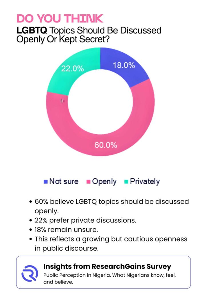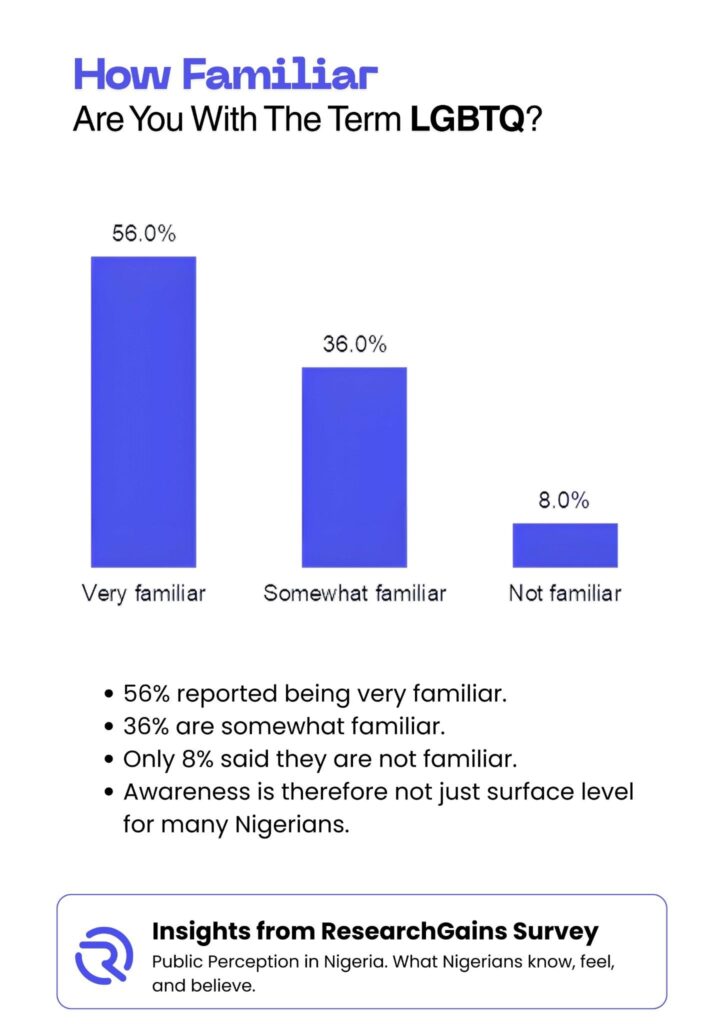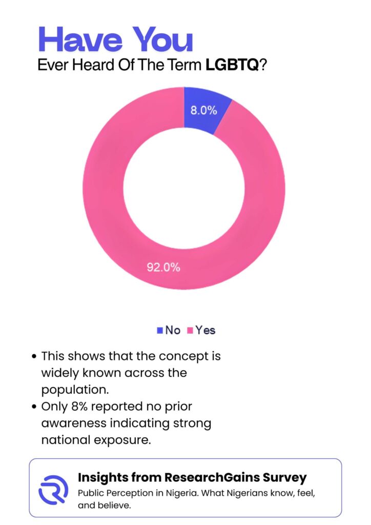 Public conversations around LGBTQ topics remain complex and often sensitive within the Nigerian social space. These discussions are shaped by long standing cultural values, strong religious influence, media exposure, and evolving global narratives. Over the past decade, digital platforms have increased access to information and have also intensified debates around identity, rights, and social norms. As a data driven research platform, ResearchGains set out to understand how Nigerians perceive LGBTQ related issues, how familiar they are with the term, and what emotions and opinions these topics evoke.
