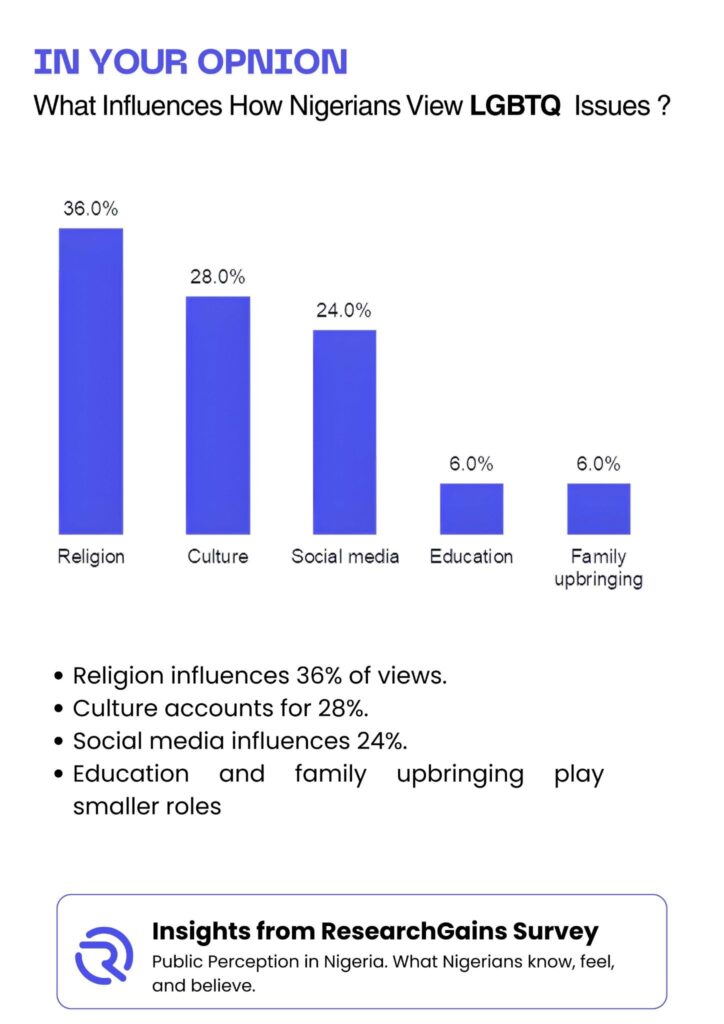 Respondents identified several factors that shape how Nigerians view LGBTQ issues. Religion ranked highest at 36%, followed by culture at 28%. Social media accounted for 24%, while education and family upbringing each accounted for 6%. This hierarchy highlights the strong influence of belief systems and cultural values, even as digital platforms continue to shape narratives and exposure.