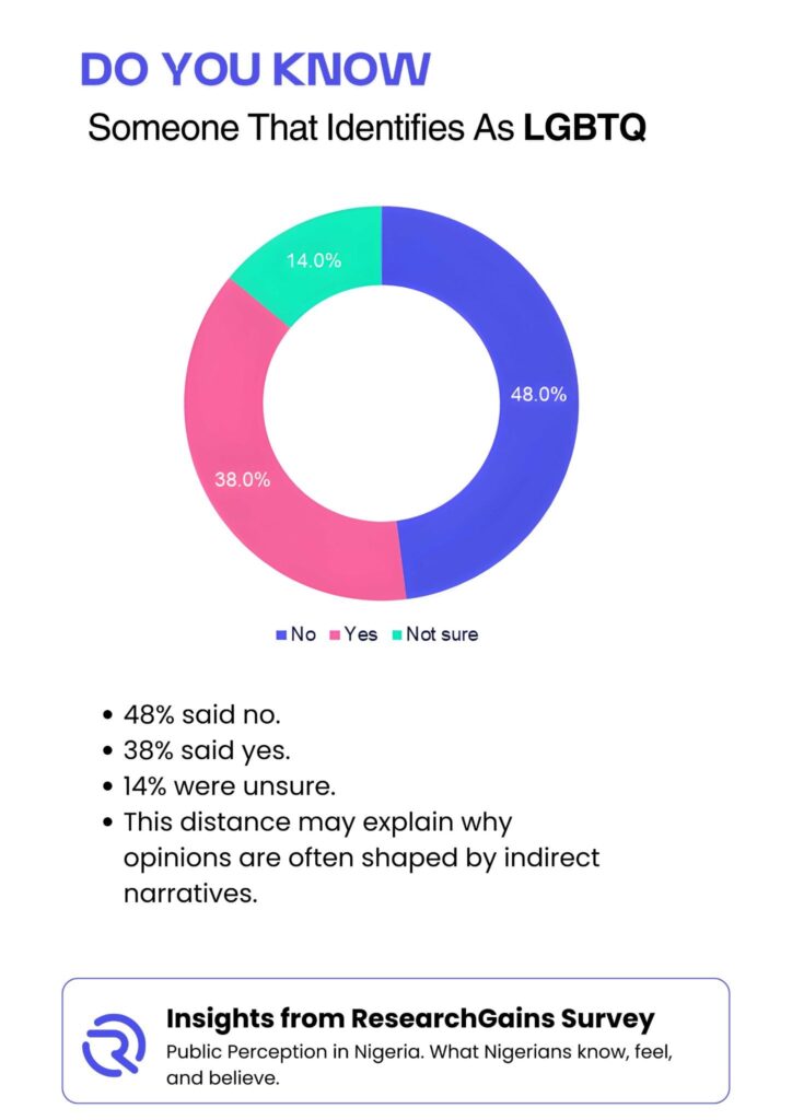 The survey also explored personal proximity to LGBTQ individuals. Nearly half of the respondents, 48%, said they did not personally know someone who identifies as LGBTQ. Meanwhile, 38% said they did, and 14% were not sure. This suggests that for many Nigerians, opinions may be shaped more by indirect information sources rather than direct personal relationships.