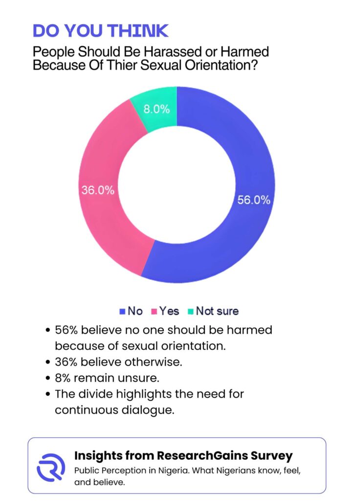 On the question of whether people should be harassed or harmed because of their sexual orientation, a majority of respondents, 56%, said No. However, 36% answered yes, while 8% remained unsure. This result reveals a clear moral divide and underscores the importance of continued dialogue around human dignity, safety, and social responsibility.