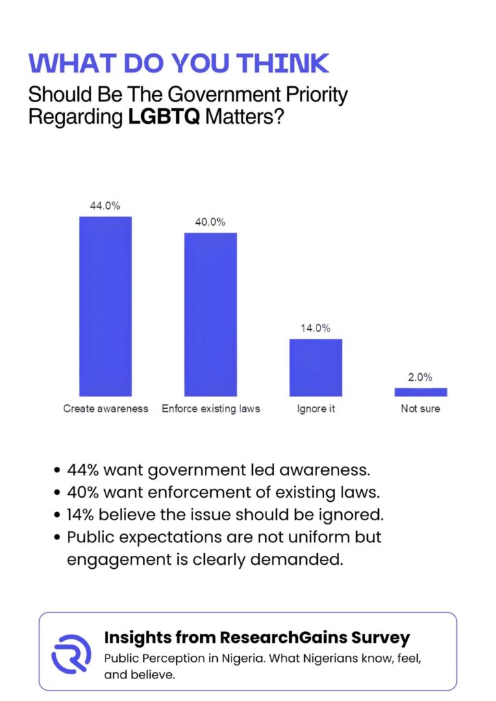 Finally, respondents shared their views on what government priorities should be regarding LGBTQ matters. Creating awareness ranked highest at 44%, followed closely by enforcing existing laws at 40%. A smaller group, 14%, believed the government should ignore the issue, while 2% were unsure. These responses suggest that many Nigerians expect structured engagement, either through public education or legal clarity, rather than complete silence.
