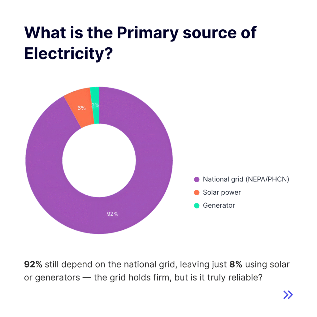 A staggering 92% of respondents rely on the national grid (NEPA/PHCN) as their primary electricity source. Just 6% use solar power, and a mere 2% depend on generators.