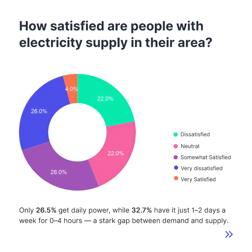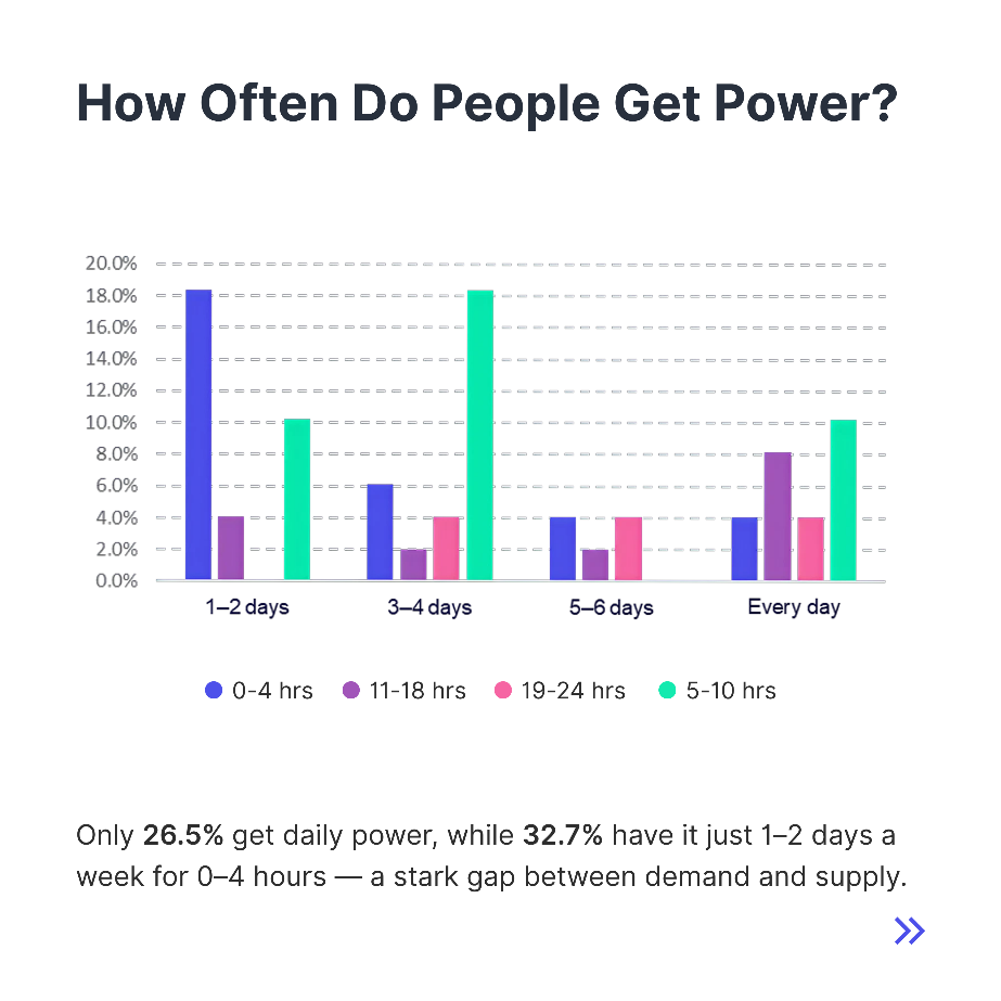 This gap between availability and need paints a clear picture: the grid is failing to meet basic expectations. Such inconsistent power disrupts everything from cooking to studying to running a business. For a country aiming to be a tech and innovation hub, these figures are more than statistics, they are roadblocks to development.