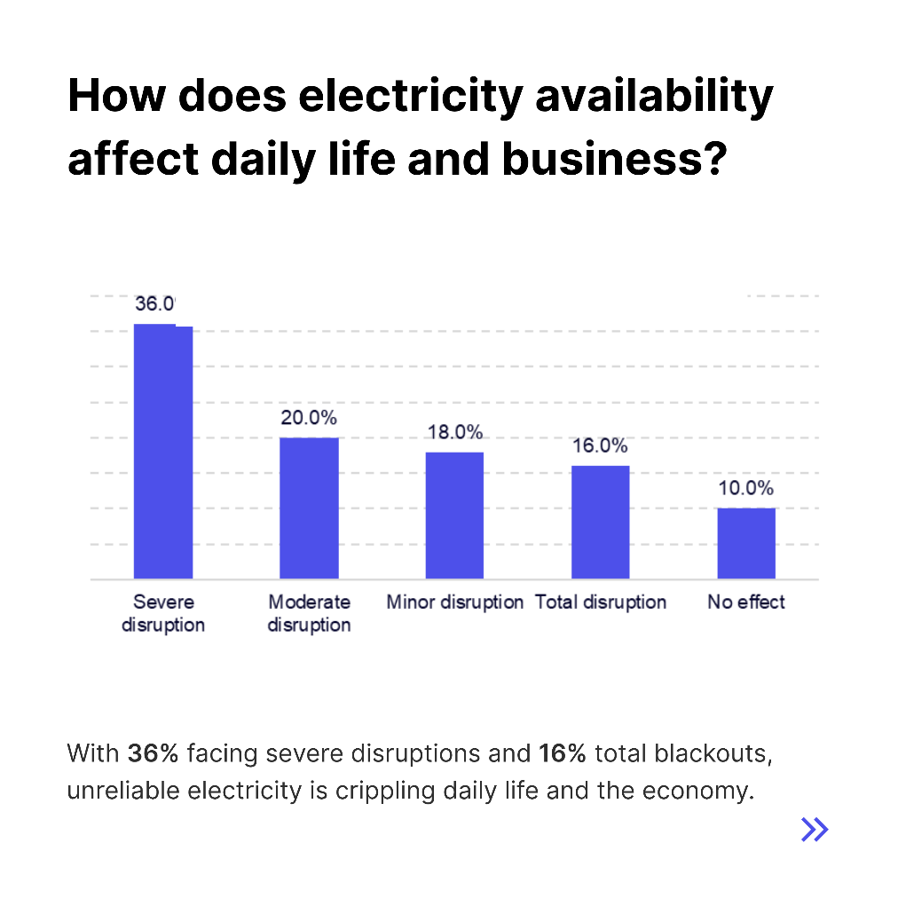 A majority of respondents are feeling the impact where it hurts most, productivity. 36% say poor electricity severely disrupts their day-to-day activities or business, and another 16% face total disruption.