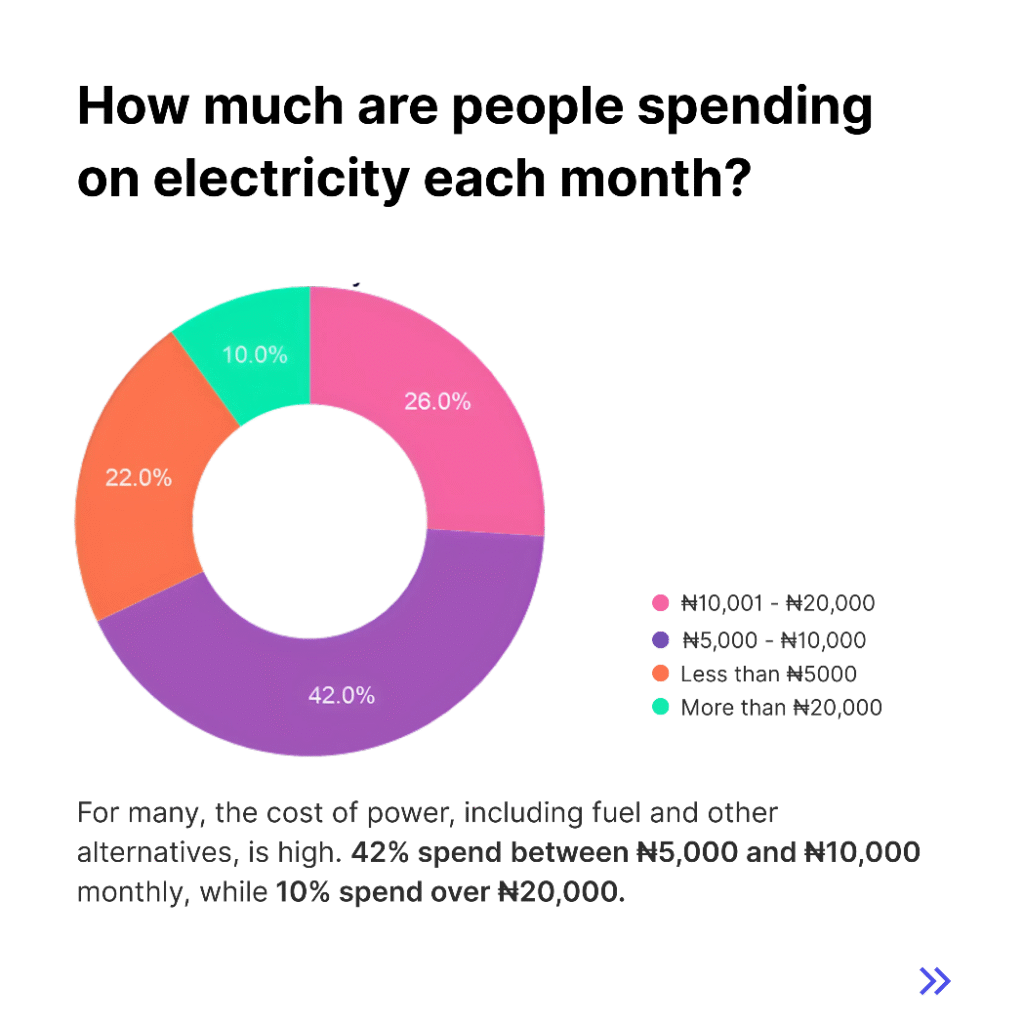 Electricity is not just unreliable, it is expensive. 42% of respondents spend between ₦5,000–₦10,000 monthly, while 26% spend ₦10,001–₦20,000, and 10% pay more than ₦20,000.
