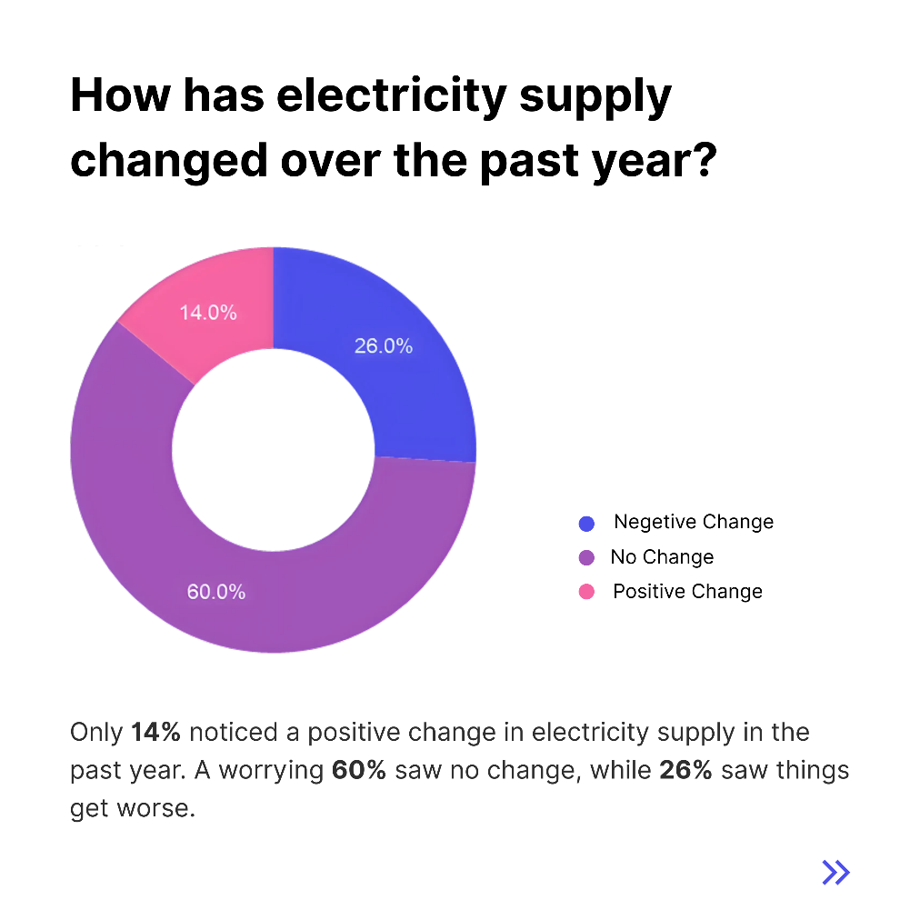 When asked about their satisfaction with electricity supply, only 4% said they were very satisfied. Meanwhile, a troubling 48% were dissatisfied or very dissatisfied.