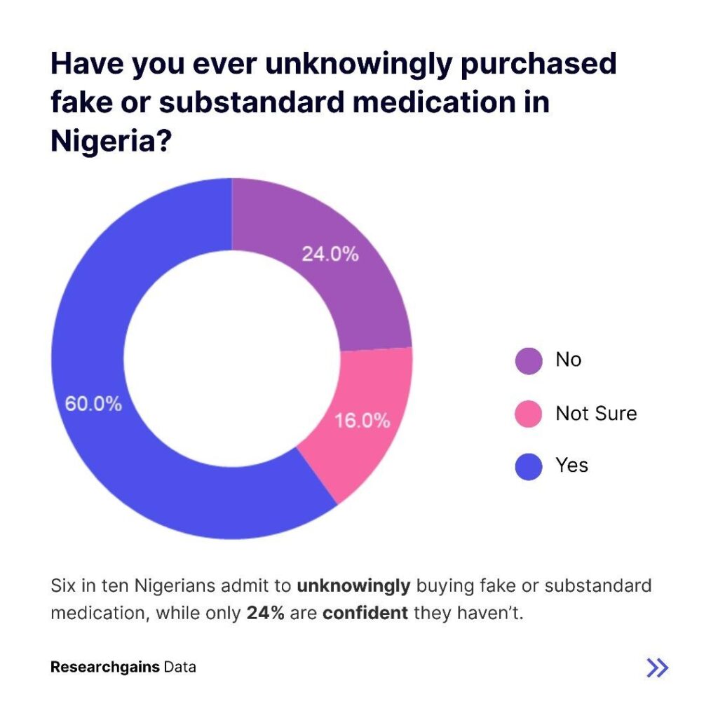 Sixty percent of Nigerians admitted to having unknowingly purchased fake or substandard medication. Only twenty four percent said they had not experienced this, while sixteen percent were unsure. This shows that the majority of people are directly or indirectly exposed to counterfeit drugs.