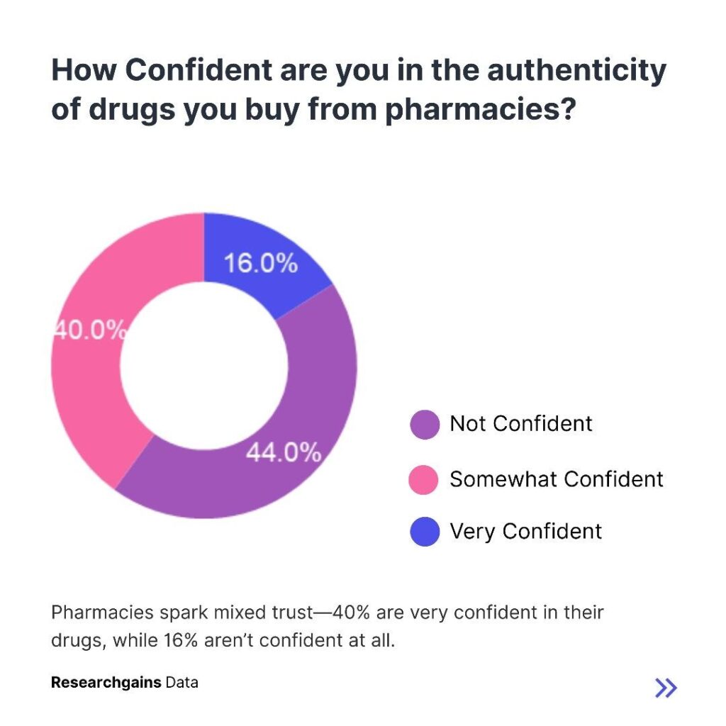 Pharmacies are expected to inspire trust, but confidence levels remain divided. Forty percent of respondents said they are very confident in the drugs they purchase from pharmacies. However, forty four percent said they are only somewhat confident, and sixteen percent said they are not confident at all. This mixed result signals the need for stronger verification systems even in trusted outlets.