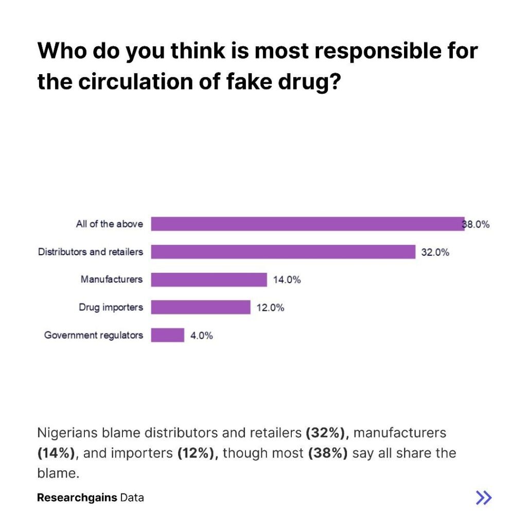When asked who bears the most responsibility for the circulation of fake drugs, thirty eight percent of respondents said all stakeholders share the blame, including regulators, importers, manufacturers, and distributors. Thirty two percent specifically identified distributors and retailers, while fourteen percent pointed to manufacturers. This shows that accountability is widely perceived as shared rather than isolated.