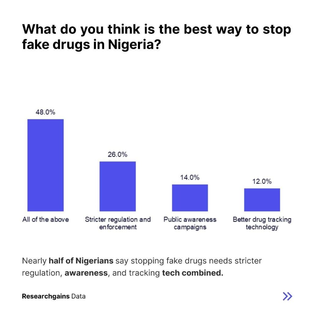 Respondents believe that tackling fake drugs requires a multi-faceted approach. Forty eight percent suggested that all possible interventions need to be combined. These include stricter regulation, public awareness campaigns, and the use of drug tracking technology. Another twenty six percent emphasized enforcement and regulation alone.