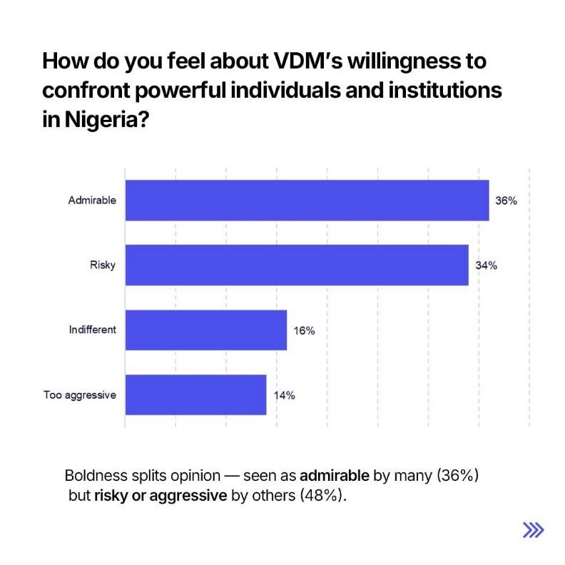 However, with 34% labeling him either an attention seeker or troublemaker, it is clear that VDM’s style polarizes as much as it provokes. To some, he is the voice Nigeria needs. To others, he is simply too loud.